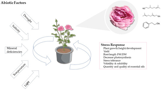 In conclusion, abiotic stresses influence the aroma of damask rose. This review highlights the abiotic stress conditions of drought, salinity, and nutrient deficiency. Drought stress can stimulate a wide range of aromatic components, with the number of aromatic components increasing. The occurrence of drought conditions is an appropriate opportunity to enhance the essential oil content and concentration of geraniol, citronellol, eugenol, and methyl eugenol, which serve as the main compounds in rose oil. Exposing rose plants to salinity stress may be a viable method for enhancing essential oil production by improving and stimulating the quality of constituents such as citronellol, geraniol, and phenylethyl alcohol. Moreover, citronellol and geraniol concentrations correlated directly with soil K and phosphorus content. We considered the main mechanisms involved in the most severe agricultural stress in crop production. The knowledge gained from this work collectively improves and increases our understanding of stress factors affecting the biosynthesis of the VOCs in damask rose. Finally, the above findings can be integrated with the already available information to improve plans for preventing stress(es) and improvising crop production impacted by the changing environment.