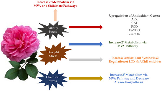 The molecular intricacies underlying the impact of combined abiotic stress on plant growth has been extensively studied. With the advent of increased bioinformatics research, there are now open-source datasets compiling the commonly expressed plant genes in response to abiotic stresses, such as salinity, drought, and metal exposure. Rose, being one of the important ornamental and cosmetic crops, has been reported for its limited yield and quality owing to drought. In R. chinensis, production of a cascade of osmotic protective agents such as sugars, amino acids, starches, and lipids were observed in response to drought stress. Genes linked to carbohydrate synthesis were found to be upregulated, which was evident with an increased accumulation of sugars in the plants exposed to drought. This was primarily reported to occur via the trehalose phosphate synthase (TPP1) pathway [113]. In R. chinensis, transcription factors belonging to the family AP2/ERF are believed to be responsible for rose’s drought stress regulation, while reports suggest the active involvement of a rose gene encoding the ethylene-responsive factor 109 (ERF109). However, there is a need for a detailed investigation into the molecular basis for its involvement. Furthermore, Jia, et al. [114] suggested that the basic helix–loop–helix (bHLH) transcription factors such as bHLH162 and bHLH35, and those from the MYB family, are particularly essential for the drought and cold responses in R. chinensis. In R. damascena, upregulation of antioxidant genes such as the APX, CAT, POD, Fe-SOD, and Cu-SOD was found to occur in response to salinity tolerance [101]. Hessini et al. [82] reported that the drought tolerance in R. damascena was mediated mainly via the increasing synthesis of antioxidants coupled with an orderly regulation of lipoxygenase (LOX) and acetylcholinesterase (AChE) activities. In another study, El-Sharnouby, et al. [115], concluded that the exposure to salinity stress stimulated and improved the quality of damask rose essential components such as citronellol, geraniol, and phenylethyl alcohol, via the MVA and shikimate pathways, respectively. In a similar study, foliar-applied silicon (Si) and water deficit stresses were found to influence the floral essential oil composition of R. damascena. Based on numerous reports, there is a suggestion that the utilisation of the is application results in an increase in methyl eugenol and n-heptadecane, along with a decrease in alkane compounds. Additionally, drought stress leads to a 1.5-fold increase in geraniol, eugenol, and citranolol, implying the effect of abiotic stress on the aromatic profile of the crop [116]. Therefore, there is a need for extensive evaluation of the mechanistic bases of abiotic stress response by damask roses to understand their functioning and improve yield and quality. Figure 5 illustrates the overall molecular response of damask rose to abiotic stressors.