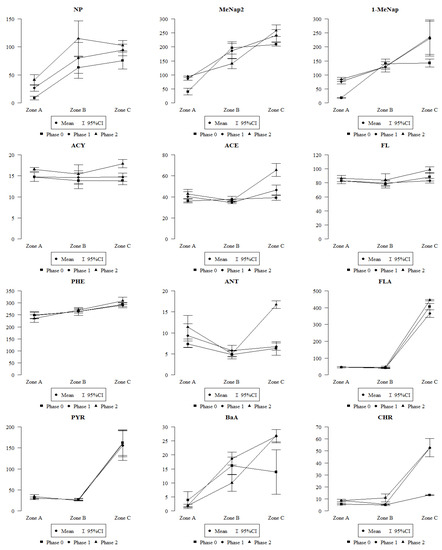 In the case of zone B interaction with phase 1, we observe that the regression parameter is −130.782; therefore, this combination of zone and phase additionally reduces SUM.PAH by an average of −130.782 µg/kg. A decrease by −192.443 µg/kg is also observed when analysing the interaction of zone B with phase 2.