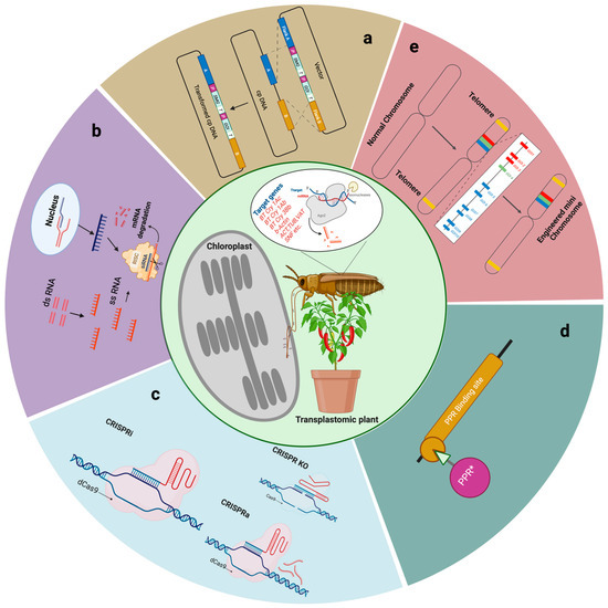 Various biotechnological approaches to combat agronomic insect pests. Chloroplast engineering strategies to develop insect pest-resistant crops using various molecular techniques, such as (a) homology-based recombination in chloroplasts, (b) chloroplast engineering mediated by RNA interference, (c) engineering chloroplasts by a CRISPR/Cas editing system, (d) RNA binding proteins (* designed pentatricopeptide repeat, PPR) to regulate gene expression in chloroplasts; (e) replicating plant mini chromosomes for chloroplast genome editing. When thrips feed on transplastomic plant mesophyll cells, they devour cellular content (sap) including chloroplasts, leading to their high mortality. This is due to designed molecules that inactivate/interfere with the target mRNAs necessary for their survival and development processes. CRISPR/Cas, clustered regularly interspaced short palindromic repeats/CRISPR-associated protein; CRISPRko, (knock out); CRISPRi, (interference); CRISRPa, (activation); ssRNA, single-strand RNA. Figure created with BioRender.com. https://www.biorender.com (accessed on 21 September 2023).