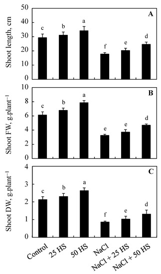 2.1. Effect of HS on the Height, Fresh, and Dry Weight of Shoot
