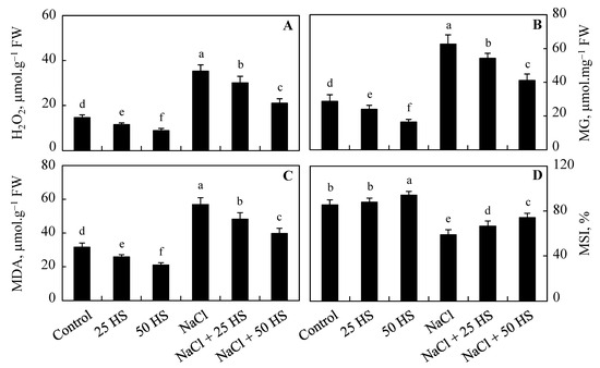 2.3. The Impact of HS Treatment and NaCl Stress on Oxidative Stress Parameters