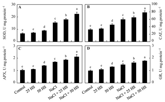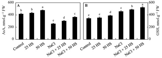 2.5. Effect of HS and NaCl Stress on the Antioxidant System