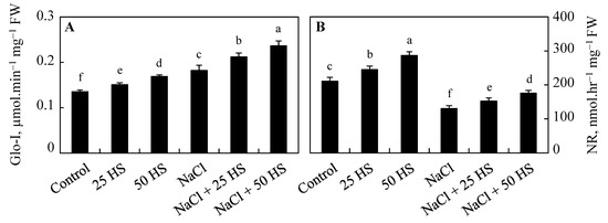 - Hasanuzzaman, M.; Hossainm, M.A.; Fujita, M. Nitric oxide modulates antioxidant defense and the methylglyoxal detoxification system and reduces salinity-induced damage of wheat seedlings. Plant Biotechnol. Rep. 2011, 5, 353–365. [Google Scholar] [CrossRef]