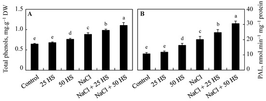 2.8. Effect of HS and NaCl on the Content of Phenol and Activity of Phenylalanine Ammonia-Lyase