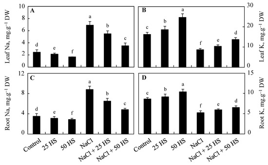 2.9. Influence of NaCl and HS on the Content of Sodium (Na) and Potasssium (K)