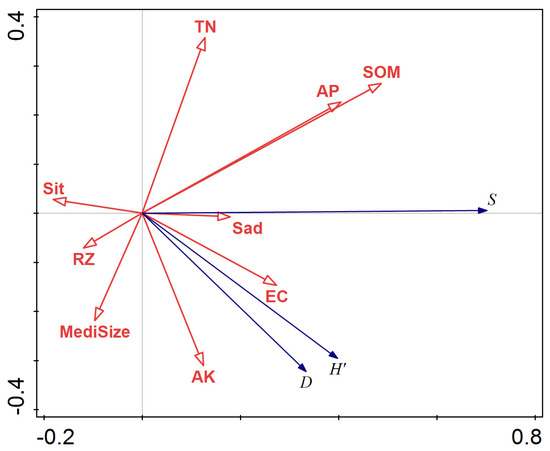 Redundancy analysis (RDA) ordination of species diversity index and soil factors for axis1 and axis2. (S = Species richness indexes; H′ = Shannon–Wiener index; D = Simpson index; Sit = powder content; Sad = sand content; medi size = median particle size; TN = total nitrogen; SOM = soil organic matter; EC = electrical conductivity; AK = available potassium content; AP = available phosphorus; RZ = soil bulk density).