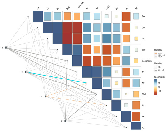Spearman correlation analysis of plant communities and soil factors in Alxa Desert (E = Pielou evenness index; S = Species richness indexes; H′ = Shannon–Wiener index; D = Simpson index; SW = soil moisture content; Cly = clay content; Sit = powder content; Sad = sand content; Median size = median particle size; TN = total nitrogen; NP = available phosphorus; SOM = soil organic matter; EC = electrical conductivity; AK = available potassium content; AP = available phosphorus; RZ = soil bulk density).