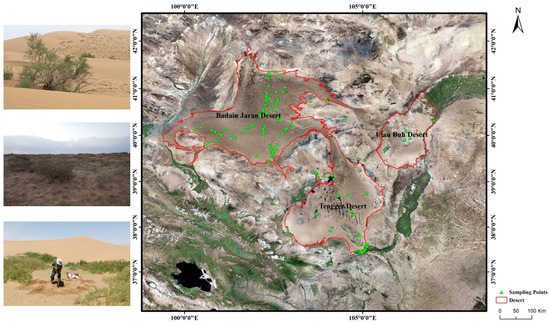 Vegetation surveys were conducted in the Badain Jaran, Tengger, and Ulanbuhe Deserts from 2009 to 2016 using the quadrat survey method. Plots were set up for different plant communities according to the experimental method of ecology of plant populations [49,50], and 2–3 replicate quadrats were randomly chosen at each plot, which contained as many plant species as possible. The area of the herbaceous quadrats was set to be 1 m × 1 m, and the range of the shrub quadrats was 10 m × 10 m. The distribution of the survey plots is shown in Figure 3. In the three deserts of Alxa, 174 plots and 479 quadrats were surveyed to investigate the distribution of plant species and the layout of species diversity, collect environmental records within the sampling range. Known the plant distribution status, 58 representative plots were set, and soil samples with different characteristics for typical plant communities were collected to analyze the relationship between plant diversity and soil environment.