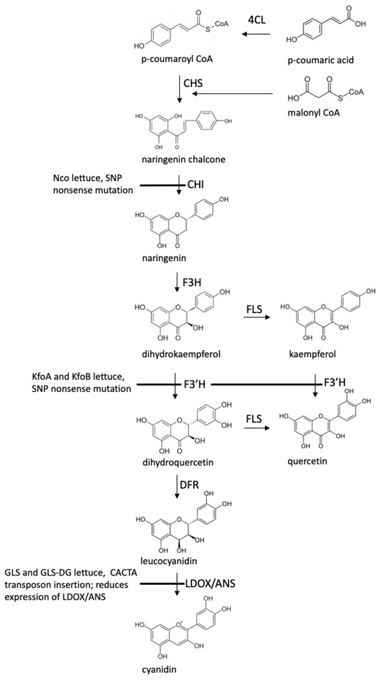 The flavonoid biosynthesis pathway showing enzymes altered in mutant lettuce lines GLS, GLS-DG, KfoA, KfoB, and Nco. Adapted from Saito et al. 2013 [35] and Gurdon et al. 2019 [16], and with additional information from Gurdon et al. 2019 [16] and Gurdon et al. 2021 [17]. Abbreviations: 4CL, 4-coumaric acid; CHS, chalcone synthase; CHI, chalcone isomerase; F3H, flavanone 3-hydroxylase; F3′H, flavonoid 3′-hydroxylase; FLS, flavonol synthase; OMT1, O-methyltransferase 1; DFR, dihydroflavonol 4-reductase; ANS, anthocyanidin synthase; LDOX, leucoanthocyanidin dehydrogenase.