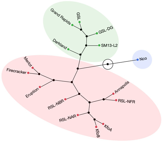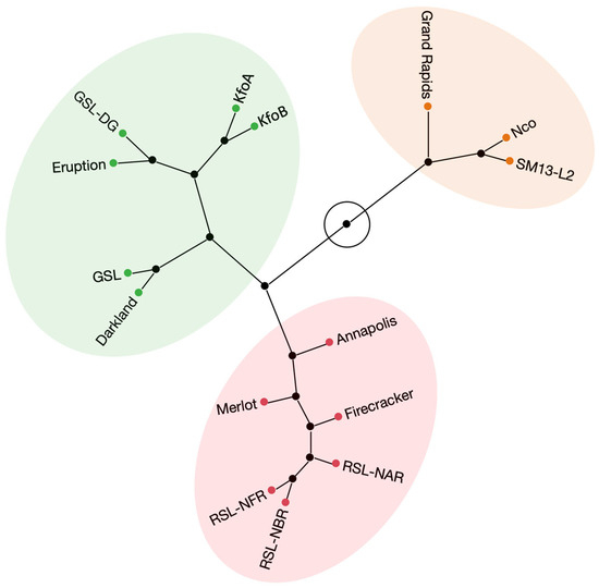 Over the two experimental years, the highest anthocyanin content was found in dark-red mutant lines RSL-NAR (8.0), RSL-NFR (7.8), and RSL-NBR (7.5), and dark-red cultivars Annapolis (7.9), Merlot (7.7), and Firecracker (7.1) (Table 2). Lower anthocyanin content was detected in red cv. Eruption (5.7). ACI-lb in green (GSL, GLS-DG, and cv. Darkland), and red-tinged (KfoA and KfoB) accessions ranged between 3.3 and 4.7. Light-green accessions (cv. Grand Rapids and SM13-L2) contained 1.8 to 1.9 ACI-lb, while the green-yellow mutant line Nco had the lowest anthocyanin content (1.3). Note that this anthocyanin quantification method provides a residual readout even in lines lacking cyanidins such as Nco. Accessions explained (ω2) approximately 0.37 and 0.92 of the variances in SPAD-sqrt and ACI-lb values, respectively (Table S1). Hierarchical clustering based on the values of anthocyanins and chlorophyll obtained by handheld meters grouped 15 accessions into three main clusters that approximately corresponded to visual color perception: a cluster containing six dark-red accessions, a second cluster containing three light-green accessions, and a third cluster consisting of green/dark green and red accessions (Figure 2). Though clustering of red cv. Eruption with green and dark-green accessions may seem unexpected, it is not surprising, as this cultivar contained substantially lower levels of anthocyanins (ACI-lb of 5.7) than accessions in the dark-red cluster (ACI-lb from 7.1–7.9) (Table 2).