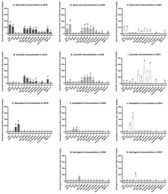 Phytochemical accumulation of four flavonoids from 15 lettuce accessions detected using UPLC-MS/MS. n = 4 for 2019, n = 3 for 2020 and 2021, significance is calculated using p-value 0.05, each bar is labeled with a letter indicating significance. Cultivars that were not grown in a specific year do not have a significance letter assigned. (A–C) Average content of quercetin, cyanidin, and kaempferol in mg/100 g fresh weight in 2019, (D–G) Average content of quercetin, cyanidin, kaempferol, and naringenin (converted from naringenin chalcone during extraction) in mg/100 g fresh weight in 2020. (H–K) Average content of quercetin, cyanidin, kaempferol, and naringenin in mg/100 g fresh weight in 2021.