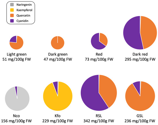 In addition to the tissue culture-derived RSL-NFR line, three more lines with unusual flavonoid accumulation were developed from cv. Firecracker [16]. These lines were visually selected from an ethyl methanesulfonate (EMS)-mutagenized population, and then characterized genetically and phytochemically [16]. Two of the lines, kaempferol overproducer A (KfoA) and kaempferol overproducer B (KfoB), accumulate glycosides of kaempferol instead of quercetin and cyanidin due to independent mutations in the flavonoid-3′ hydroxylase (F3′H) gene, the product of which converts dihydrokaempferol into dihydroquercetin, and kaempferol into quercetin [16]. Kaempferol is a flavonol that has been shown to have anti–diabetic, pancreatic β-cell protecting, and anti-inflammatory effects in vitro and in vivo [25]. Both Kfo lines accumulate kaempferol at levels higher than other vegetables and fruits, apart from capers [16,26,27,28,29,30]. The third line, naringenin chalcone overproducer (Nco) accumulates glycosides of naringenin chalcone, a compound not previously reported in lettuce, and which has been shown to have anti-inflammatory, anti-allergic, and anti-obesity effects [16,31,32,33]. Nco carries a mutation in the chalcone isomerase (CHI) gene, the product of which converts naringenin chalcone to naringenin, which in wild-type lettuce gets further converted to flavonoids and anthocyanidins [16]. The major plant source of naringenin chalcone is tomato peel [34], where it accumulates to a similar level as in Nco lettuce. Figure 1 shows enzymes of the flavonoid biosynthesis pathway and alterations in GLS, GLS-DG, KfoA, KfoB, and Nco mutant lines.