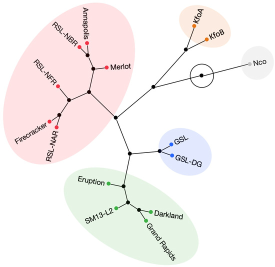 Hierarchical clustering based on the content of four flavonoids identified five clusters (Figure 6). The largest cluster contained three dark red accessions (cvs. Annapolis, Firecracker, and Merlot) plus three dark-red mutant lines (RSL-NAR, RSL-NBR, and RSL-NFR). The second-largest cluster consisted of three green accessions (cvs. Darkland and Grand Rapids, breeding line SM13-L2) and red cv. Eruption. The remaining three clusters contained a group of two mutant lines accumulating elevated levels of quercetin (GSL and GSL-DG), kaempferol (KfoA and KfoB), and naringenin (Nco).