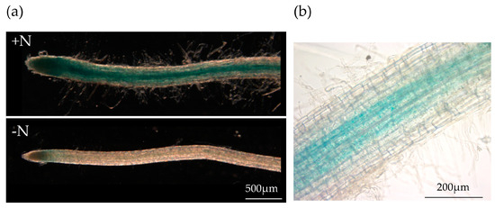 promStCLE4:GUS expression in potato roots. (a) The promStCLE4-driven GUS reporter is more active in the roots grown in N-rich media (+N). (b) The StCLE4 promoter activity in the vascular tissues of the root.