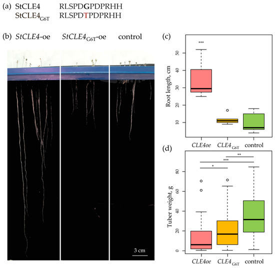 To further investigate the functions of StCLE4, we used antagonistic peptide technology [5]. Specifically, we created an antagonistic StCLE4 construct by mutating a codon encoding glycine in the CLE motif-coding region (which is known to play a crucial role in the biological activity of CLE) to threonine-coding codon (G6T) (Figure 2a). Vectors carrying the StCLE4 and StCLE4G6T genes under the constitutive 35S promoter were obtained. The overexpression of StCLE4 resulted in the stimulation of root growth in aeroponic nutrient medium without nitrogen (Figure 2b,c) and the reduction in tuber weight (Figure 2d). At the same time, we did not detect any alterations in the growth of StCLE4G6T-overexpressing potato plants, except lower tuber weight (Figure 2 and Figures S1 and S2).