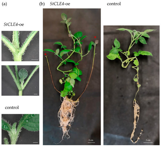Effects of StCLE4 overexpression (StCLE4-oe) on apex growth of three-week-old plants (a) and stolon growth of two-month-old plants (b) that were grown in a growth chamber under long days (16 h light/8 h dark and 22 °C). Non-swelling stolons that transformed into branches are marked by a red asterisk. Scale bar in panel (a) = 2 mm.
