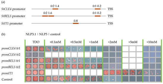NLPs are known to bind to nitrate-response elements (NREs) and activate the expression of nitrate-regulated genes in response to high nitrate levels [11]. We searched for the NREs in the promoter of the StCLE4 gene, and in the promoters of major regulators of tuber development (StBEL5, StSP6A, and StIT1 genes) using the motifs described in the studies by Nishida et al. [12] and Laffont et al. [13] In the promoters of the StIT1, StCLE4, and StBEL5 genes, we found one, two, and three putative NLP-binding sites, respectively (Figure 4a, Table S2). Next, we checked whether these putative NREs motifs could be bound by StNLP3.1 and StNLP5 using yeast one-hybrid assay. We found that StNLP3.1 and StNLP5 bound to the promoter of the StIT1 gene, whereas no interaction was detected for the StCLE4 and StBEL5 promoters (Figure 4b).