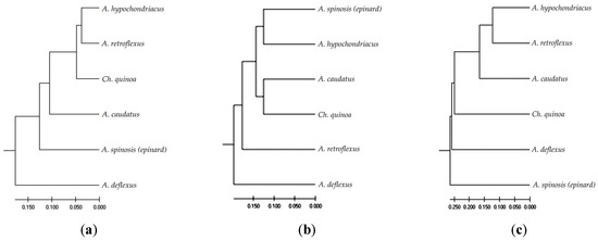 The cluster analysis results based on the retrotransposon analysis indicated that A. retroflexus, A. hypochondriacus, and A. caudatus (Figure 1c) exhibit the highest genetic similarity. In contrast, A. spinosis (epinard) showed the greatest genetic diversity and differed significantly from the other species.