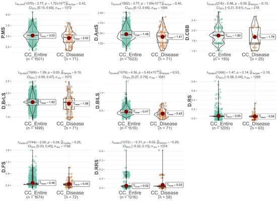 A comparative analysis of various attributes associated with resistance to pests and diseases in cassava. The analysis compares the thematic collection specifically focused on pest and disease resistance (CC_Disease) with the complete collection (CC_Entire). The attributes evaluated include: mite severity (P.MS), anthracnose severity (D.AntS), bacterial blight severity (D.CBB), brown (D.BrLS) and blight leaf spot severity (D.BlLS), rust severity (D.RS), frogskin severity (D.FS), and root rot severity (D.RRS).