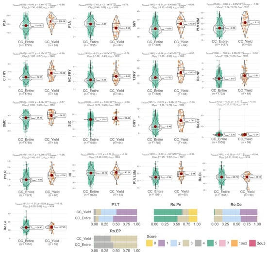 A comparative analysis of yield attributes in cassava genotypes: Thematic collection for yield attributes (CC_Yield) versus the entire collection (CC_Entire) for these traits: plant height (Pl.H), plant architecture (Pl.A), plant type (Pl.T), shoot yield (ShY), marketable fresh root yield (C.FRY), unmarketable fresh root yield (NC.FRY), total fresh root yield (T.FRY), dry matter content (DMC), starch Content (StC), dry root yield (DRY), harvest index (HI), cortex thickness (Ro.CT), presence of peduncle (Ro.Pe), root constriction (Ro.Co), average root length (Ro.Le), average root diameter (Ro.Di), easy root peeling (Ro.EP), leaf retention (Pl.LR), plant vigor at 1.5 months (Pl.V1.5M), plant vigor at 12 months (Pl.V12M), average number of roots per plant (Ro.NP).