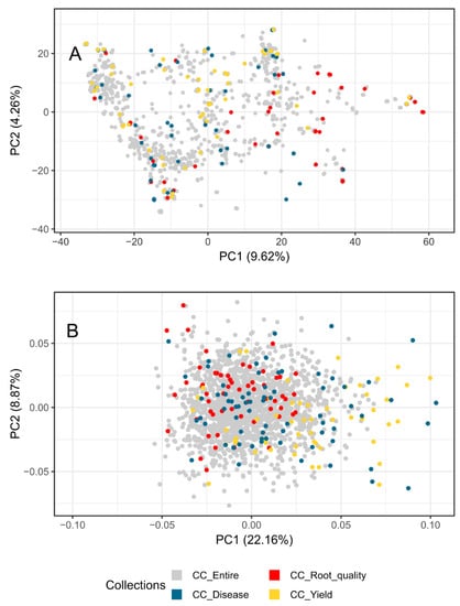 Principal component analysis (PCA) of 1810 cassava accessions based on molecular data from 20,023 SNPs (A) and phenotypic data from 27 quantitative traits (B). Accessions belonging to specific thematic collections for yield traits (CC_Yield), resistance to pests and diseases (CC_Disease), and root quality traits (CC_Root_quality) are indicated by different colors.