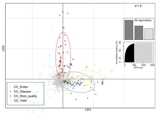 Furthermore, to discriminate between the cassava thematic collections and the entire collection, a discriminant analysis of the principal components (DAPC) available in the adegenet package for R version 4.2.2 [], which considered both quantitative and molecular phenotypic data, was employed. The principal components that accounted for more than 80% of the total variance in the data were retained, and cassava genotypes were assigned to their respective thematic collections (CC_Yield, CC_Disease, and CC_Root_quality) based on a priori grouping.
