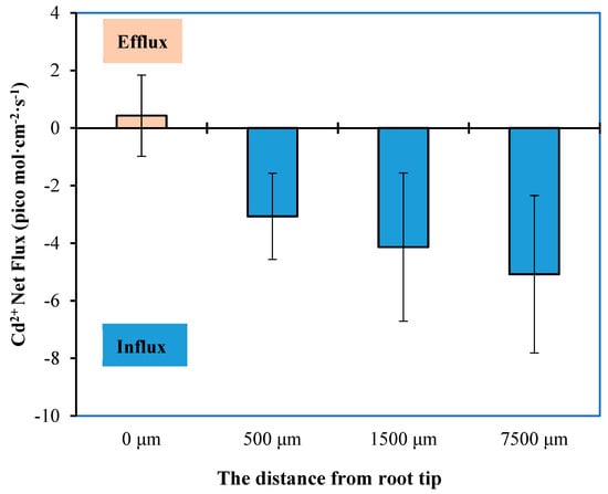 The roots, being the primary organ responsible for water and mineral absorption, exhibit varying rates of Cd absorption when exposed to a Cd environment. Figure 1 illustrates the occurrence of Cd efflux at the measurement point (0, 500, 1500, and 7500 µm) located at the root tip. As the distance between the measurement point and the root tip progressively increased, the real-time Cd influx rate exhibited a corresponding increase. Ultimately, the maximum inflow rate of Cd by root cells was determined at the measurement point situated 7500 µm away from the root tip, measuring 5.078 pico mol cm−2 s−1.