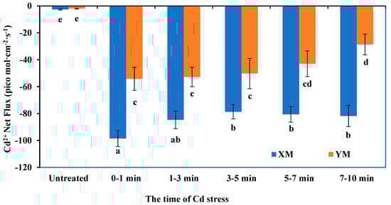 Measurement of net Cd fluxes at a specific site of roots: Based on the findings pertaining to the net fluxes of Cd at various root locations of XM, the site (7500 μm away from the root tip) exhibiting the highest net absorption fluxes of Cd was designated as the NMT detection site for assessing the real-time rate of Cd entry and exit from roots. In accordance with the aforementioned methodology, XM and YM seedlings were carefully chosen and immobilized, and the relevant sections were subjected to leakage. Subsequently, a measuring solution (consisting of 1 µmol L−1 CdCl2, 1 µmol L−1 CaCl2, and pH 6.0) was introduced into a Petri dish to fully submerge the roots, allowing for a 20 min period of rest. The measuring solution was then discarded, and 5 mL of fresh measuring solution was added for subsequent analysis of the sample. During microscopic examination, a specific point located 7500 μm away from the root tip was identified, and the Cd flux microsensor was positioned approximately 10 μm above the designated area for detection. Following 5 min of data collection, a 100 µmol L−1 CdCl2 solution was introduced to the Petri dish, and data collection continued for an additional 10 min until no significant changes in the signal were observed. Each group underwent 8 replicates for data collection. The imFluxes V2.0 software (YoungerUSA LLC, Amherst, MA 01002, USA) was employed to directly read the Cd flux data.