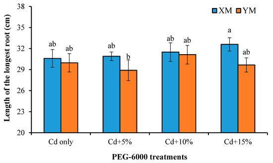 Effects of different drought stress induced by polyethylene glycol (PEG-6000) treatments on the longest root lengths of XM (high-grain Cadmium (Cd)-accumulating genotype) and YM (low-grain Cd-accumulating genotype) under 100 µmol L−1 of Cd stress. The different letters indicate significant differences at p < 0.05 according to a least significant difference (LSD) test.
