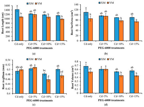 Effects of different drought stress induced by polyethylene glycol (PEG-6000) treatments on the root lengths (a), root surface areas (“Root SurfArea”) (b), average root diameters (“Root AvgDiam”) (c), and root volumes (d) of XM (high-grain Cadmium (Cd)-accumulating genotype) and YM (low-grain Cd-accumulating genotype) under 100 µmol L−1 of Cd stress. The different letters indicate significant differences at p < 0.05 according to a least significant difference (LSD) test.