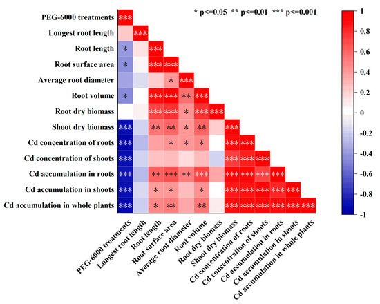 A correlation analysis was performed to examine the associations between PEG-induced drought stress and the root morphologies, as well as the concentration and accumulation of Cd in XM and YM. The findings (Figure 5) indicated highly significant negative correlations (p < 0.001) between PEG-6000 concentrations and shoot dry biomass, Cd concentration in roots and shoots, and Cd accumulation in roots, shoots, and entire plants. Significant negative correlations (p < 0.05) were observed between PEG-6000 concentrations and the length, surface area, and volume of roots. The Cd concentration in roots exhibited a highly positive correlation with the surface area, diameter, and volume of roots (p < 0.05; correlation coefficients of 0.456, 0.439, and 0.486, respectively), while the Cd concentration in shoots displayed a positive correlation with the Cd concentration in roots (p < 0.001; correlation coefficients of 0.860). The accumulation of Cd in the whole plant demonstrated a highly significant correlation with the dry biomass of shoots, Cd concentration in roots, Cd concentration in shoots, Cd accumulation in roots, and Cd accumulation in shoots (p < 0.001; 0.919, 0.933, 0.927, 0.914, and 0.986, respectively). Furthermore, it exhibited significant correlations with root surface area and root volume (p < 0.01; 0.534 and 0.549, respectively), as well as a significant correlation with root length (p < 0.05; 0.487). The correlation analysis results confirmed that augmenting the concentration of PEG-6000 treatment yielded a reduction in Cd concentration of both the roots and shoots, thereby impeding the accumulation of Cd in these plant parts. Simultaneously, this treatment exerted a substantial inhibitory impact on root morphology and shoot dry biomass. Consequently, the inhibitory effect of drought stress on Cd uptake and accumulation was meaningful only when plant biomass did not decrease significantly.