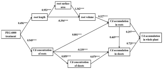 Furthermore, we constructed a path relationship model (as shown in Figure 6) using root length, root surface area, root volume, Cd concentration in roots, Cd concentration in shoots, Cd accumulation in roots, and Cd accumulation in shoots that all had been confirmed to be significantly correlated with the Cd accumulation in the whole plant in the Pearson correlation coefficient analysis. The corresponding osmotic potentials of 0 MPa, −0.100 MPa, −0.200 MPa, and −0.388 MPa for each PEG-6000 treatment were input into the model, and the path analysis was carried out. The results showed that the impact of PEG-6000 treatments on root morphology was primarily manifested through alterations in root length, which subsequently affected the surface area of the roots and co-contributed to the overall development of root volume. The concentration of Cd in roots exhibited a noteworthy positive effect on the accumulation of Cd in roots and the concentration of Cd in shoots while displaying a significant negative effect on the accumulation of Cd in shoots. Additionally, the root volume also had a positive influence on the accumulation of Cd in the roots, while the accumulation of Cd in the shoots was positively influenced not only by the concentration of Cd in the shoots but also by the accumulation of Cd in the roots. Both the accumulation of Cd in the roots and shoots had positive effects on the Cd accumulation in the whole plant, with the effect of Cd accumulation in the shoots being greater than that in the roots.
