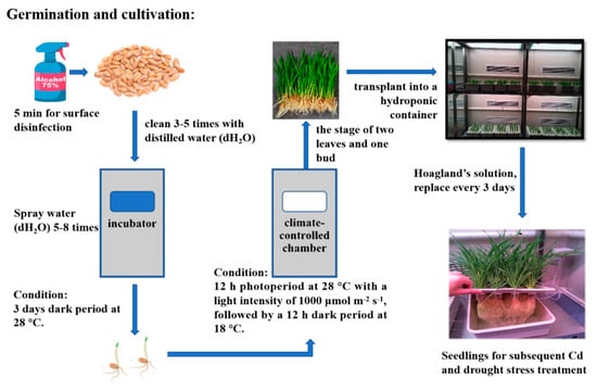 Germination and cultivation: As shown in Figure 7, the seeds of XM and YM were soaked in 75% (v/v) ethanol for 5 min for surface disinfection and then rinsed thoroughly with distilled water (dH2O). The soaked seeds were placed on sterilized gauze and then moved to an incubator for germination at 28 °C. Distilled water was sprayed evenly on the surface of the seeds to moisten them. After complete emergence, seeds were transplanted onto breeding plates and cultivated in a climate-controlled chamber set to a 12 h photoperiod at 28 °C with a light intensity of 1000 μmol m−2 s−1, followed by a 12 h dark period at 18 °C. When the seeds were at the stage of two leaves and one bud, homogenous seedlings with their entire roots were transplanted into a hydroponic container and placed back in the climate-controlled chamber for further cultivation. The conditions for hydroponic experiments were strictly controlled, and the nutrient solution was replaced every three days. After sufficient plant biomass was obtained, the seedlings were moved to a particular nutrient solution for subsequent stress treatments.