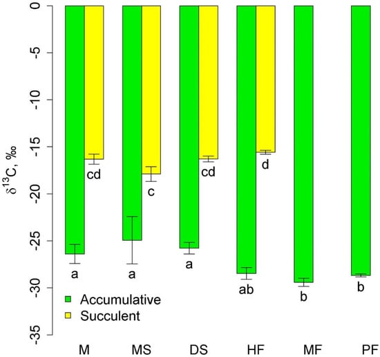 δ13C in accumulative and succulent epiphytes in different communities (mean and standard error). Phu Quoc: M—mangroves, MS—melaleuca savanna, and DS—dry savanna. Cat Tian: HF—high-stem forest. Bidoup: MF—mossy forest and PF—Pinus forest. Different letters show significantly different values (p < 0.05, Approximative Fisher–Pitman permutation test).