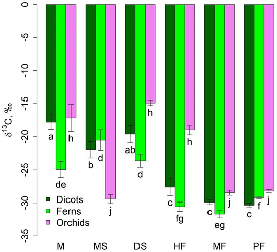 Leaf δ13C of dicots, orchids, and ferns in different communities (mean and standard error). Phu Quoc: M—mangroves, MS—melaleuca savanna, and DS—dry savanna. Cat Tian: HF—high-stem forest. Bidoup: MF—mossy forest and PF—Pinus forest. Different letters show significantly different values (p < 0.05, Approximative Fisher–Pitman permutation test).