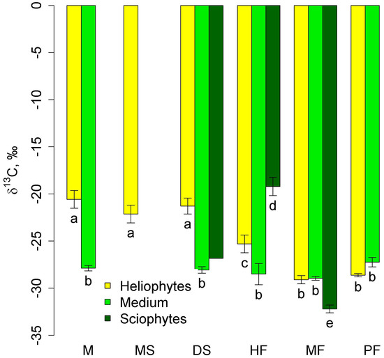 Leaf δ13C of autotrophic heliophytes, mid-stem epiphytes, and sciophytes in different communities (mean and standard error). Phu Quoc: M—mangroves, MS—melaleuca savanna, DS—dry savanna. Cat Tian: HF—high-stem forest. Bidoup: MF—mossy forest and PF—Pinus forest. Different letters show significantly different values (p < 0.05, Approximative Fisher–Pitman permutation test). Since in the dry savanna there is only one sample of sciophytes, the significance is not shown.