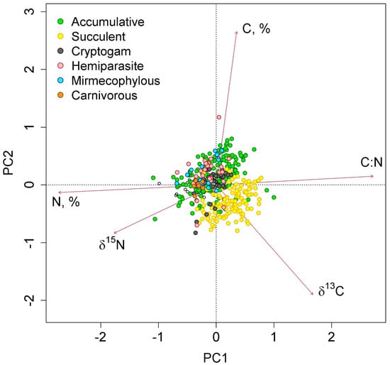 More interesting is the comparison of the δ13C and δ15N relationship using the aforementioned method: we see, in general, the formation of several clusters, where succulent epiphytes gravitate more toward strong CAM at more negative values of δ15N, and accumulative epiphytes gravitate toward weak CAM or C3 at more positive values of δ15N (Figure 7d,g,k). This is in good correspondence with Stewart et al. [56] who, based on δ15N values and total nitrogen concentrations, distinguished two groups of epiphytes—one with low total nitrogen and low 15N as well as one with higher total nitrogen and δ15N. However, no clear correlation between δ13C and δ15N was found [25] and appears not to be meaningful in the context of methods that assess correlation (Table 1).