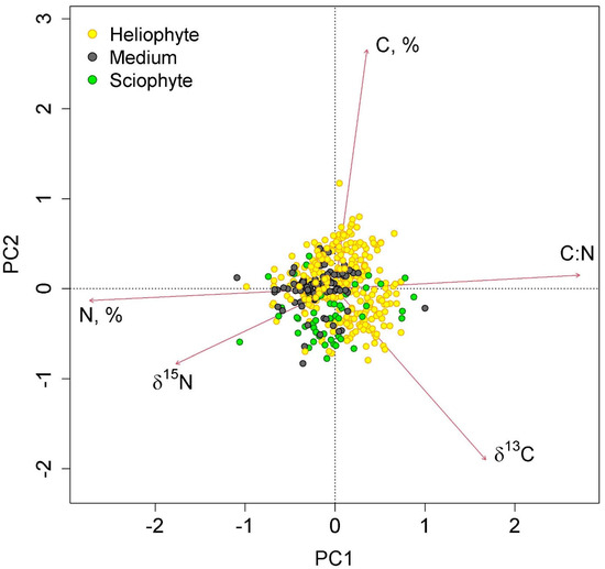 The first two axes of greatest variation explained 70.0% of the variance in the parameters of nitrogen and carbon content in epiphyte leaves (Figure 4 and Figure 5). The first axis was negatively correlated with nitrogen content, and the second axis was negatively correlated with carbon content.