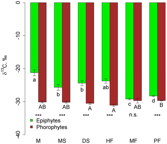 Leaf δ13C of epiphytes and their phorophytes in the different communities (mean and standard error. Phu Quoc: M—mangroves, MS—melaleuca savanna, and DS—dry savanna. Cat Tian: HF—high-stem forest. Bidoup: MF—mossy forest and PF—Pinus forest. Different letters show significant differences between communities (p < 0.05, Approximative Fisher–Pitman permutation test, lowercase letters—epiphytes, and uppercase letters—phorophytes). Asterisks show differences between epiphytes and phorophytes within the same community (Approximative General Independence Test): ***—p < 0.001 and n.s.—non-significant.