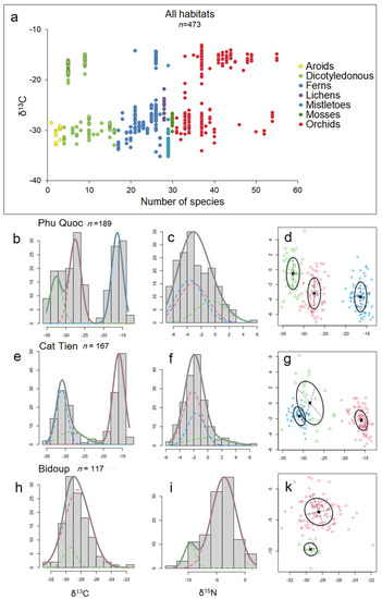 Our study revealed both trends similar to those described in the literature and contradicted them, which can be explained by a different set of biomorphological features of epiphytes from tropical Asia, compared to Neotropis epiphytes, where the majority of such work has been conducted. The general trends of δ13C distribution on the one hand resemble those traditionally described: we see that there is a bimodal distribution of δ13C within epiphytic plant taxa (Figure 7a), and on the other hand, the study of Gaussian distributions via mixture modeling using the Rmixmod R package [55] showed a more complex pattern reminiscent of that recently described by Messerschmid et al. [3]. Thus, for Phu Quoc epiphytes: the histogram of δ13C values shows a trimodal distribution (Figure 7b), for Cat Tien epiphytes shows a bimodal distribution (Figure 7e), and for Bidup shows a unimodal distribution (Figure 7h), with a unimodal distribution of δ15N in all cases (Figure 7c,f,i).
