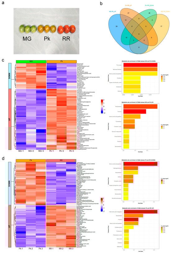 Metabolome analysis of fruit at different stages: mature green (MG), pink (Pk), and red ripe (RR): (a) Representative picture of Yu-nu fruit at three sampling stages. (b) Venn diagram showing differentially accumulated metabolites (DAMs) between MG-Pk and Pk-RR stages. (c) Accumulation profiles of DAMs from MG to Pk. The heatmap on the left illustrates changes in DAM accumulation, and the bar charts on the right depict the enrichment of metabolite sets for increased (UP) and decreased (DOWN) DAMs. (d) Accumulation profiles of DAMs from Pk to RR. The heatmap on the left illustrates changes in DAM accumulation, and the bar charts on the right depict the enrichment of metabolite sets for increased (UP) and decreased (DOWN) DAMs.