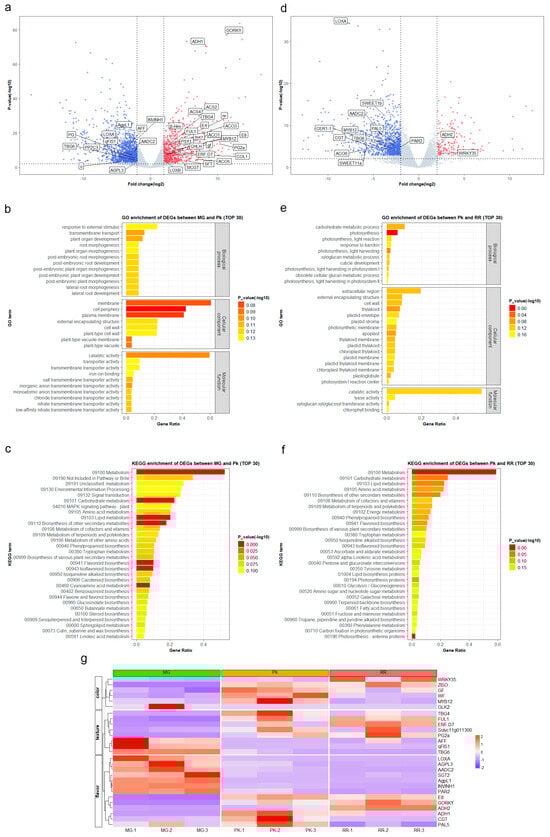 Transcriptome analysis of fruit at the mature green (MG), pink (Pk), and red ripe (RR) stages: (a) Volcano plot showing the differentially expressed genes (DEGs) between MG and Pk. Red dots represent upregulated genes, while blue dots represent downregulated genes. The same applies to (d). (b) GO enrichment analysis of DEGs between MG and Pk. (c) KEGG pathway enrichment analysis of DEGs between MG and Pk. (d) Volcano plot showing the DEGs between Pk and RR. (e) GO enrichment analysis of DEGs between Pk and RR. (f) KEGG pathway enrichment analysis of DEGs between Pk and RR. (g) Expression profiles of genes involved in color, texture, and flavor from MG to RR. The color transition from blue to red corresponds to increasing expression levels.