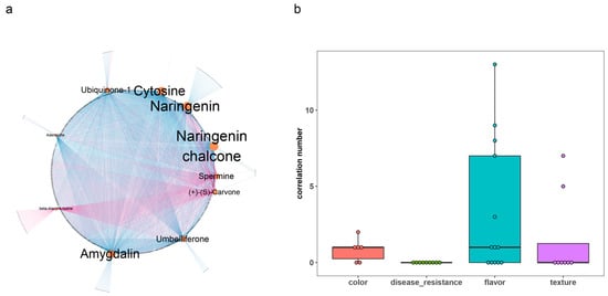 Correlation analysis between DAMs and DEGs: (a) Visualization of the correlation between DAMs (top ten) and DEGs in a network graph. Nodes represent DAMs and DEGs, and node size reflects the abundance of correlation. Correlated nodes are connected by edges, with pink indicating positive correlation and blue indicating negative correlation. (b) Box plot showing the abundance of correlated DAMs for well-characterized genes. Dots represent the well-characterized genes (color: GF, SlWRKY35, UNIFORM, WF, SlMYB12, and ZISO; disease resistance: Cf-2, Cf-10, Ph-2, Sm, Rx4, and four quantitative trait loci; flavor: AADC2, ADH1, ADH2, AGPL1, AGPL3, E8, GORKY, INVINH1, LOXA, PAL5, PAR2, SGT2, and SlCGT; and texture: AFF, FUL1, PG2a, qFIS1, SlERF.D7, Solyc11g011300, TBG4 and TBG6).