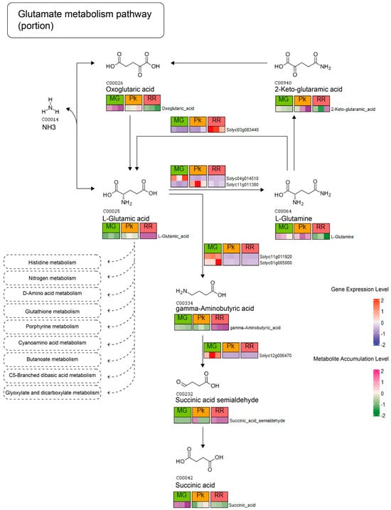 Glutamate metabolism pathway from KEGG, depicting the expression and accumulation profiles of DEGs and DAMs. The color gradient indicates the level of gene expression, ranging from blue (low expression) to red (high expression). Similarly, the color gradient represents the level of metabolite accumulation, transitioning from green (low accumulation) to pink (high accumulation).