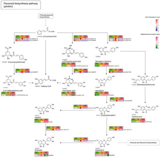 Flavonoid biosynthesis pathway from KEGG, illustrating the expression and accumulation profiles of DEGs and DAMs. The color gradient indicates the level of gene expression, ranging from blue (low expression) to red (high expression). Similarly, the color gradient represents the level of metabolite accumulation, transitioning from green (low accumulation) to pink (high accumulation).