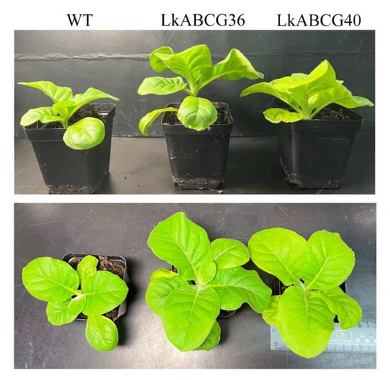 The AtABCG36 transporter plays a dual role in the transport of IBA [20,21], and AtABCG40 is a high-affinity abscisic acid (ABA) transporter [22]. However, no studies have been conducted on the function of LkABCG36 and LkABCG40 in Larix kaempferi. In addition, the mechanisms of the effects of LkABCG36 and LkABCG40 on plant organ growth, development, and environmental adaptation are still unclear. As such, to explore the function of LkABCG36 and LkABCG40, we overexpressed these genes in a model organism (Nicotiana tabacum).