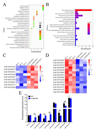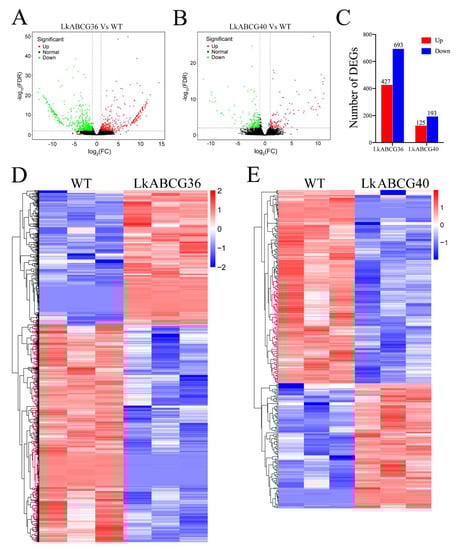 Transcript level profiles analysis of significantly differentially expressed genes. (A,B) Volcano plots of significantly differentially expressed genes (DEGs) between LkABCG36 (A) or LkABCG40 (B) and WT groups. DEGs were identified by comparing gene expression values with |log2(fold change)| ≥ 1 and p < 0.05. (C) Number of DEGs was counted. We found 427 and 693 significantly up- and downregulated genes, respectively, in LkABCG36 group compared with WT group. We found 125 and 193 significantly up- and downregulated genes, respectively, in LkABCG40 group compared with WT group. (D,E) Heatmap of DEGs between ABCG36 and WT groups (D), and between LkABCG40 and WT groups (E). FPKM values (transcript levels) were transformed to log10 (FPKM) for color scaling.