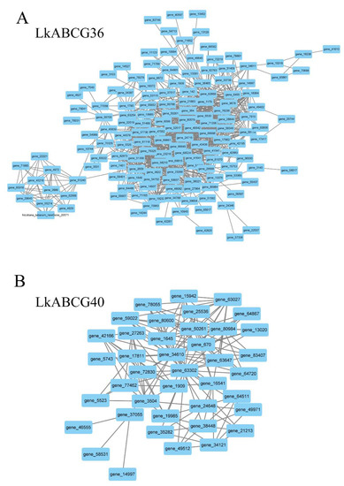 Characterization of DEGs in LkABCG36 and LkABCG40 groups. (A) Co-expression network analysis of DEGs in LkABCG36 group; (B) Co-expression network analysis of DEGs in LkABCG40 group.