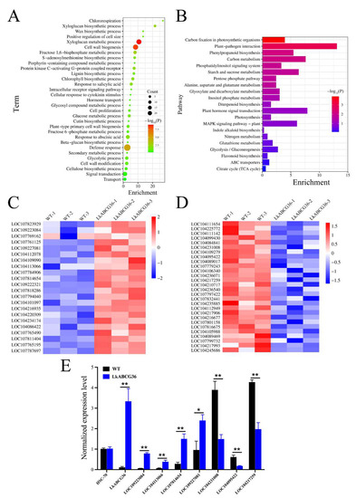 To explore the functional significance of the genes that were differentially expressed between the LkABCG36 and WT groups, we first performed Gene Ontology (GO) enrichment analysis (Figure 4A). We found significant enrichment of genes relevant to cell wall biogenesis, including those involved in xyloglucan metabolism, xyloglucan and lignin biosynthetic processes, and cell wall modification. In addition, we found enrichment in energy metabolism processes such as the fructose 1,6-bisphosphate and glucose metabolic processes, the glycolytic process, and chlororespiration. Furthermore, we identified enrichment in the defense response processes, such as in the response to abscisic acid and salicylic acid, the wax biosynthetic process, and the cellular response to cytokinin stimulus. Moreover, certain transport and signal transduction terms were also enriched, such as in hormone transport and intracellular receptor signaling pathways.